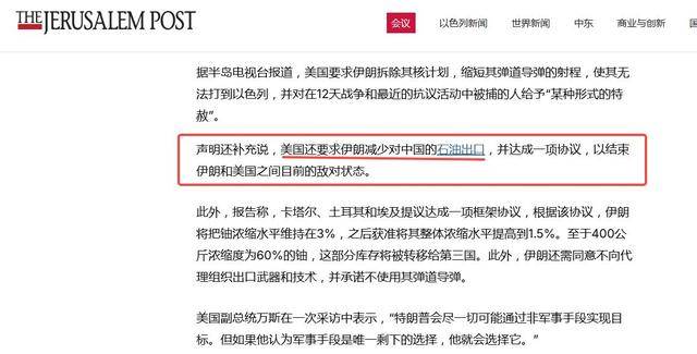 但最让人警觉的不是这些军事条款,而是夹杂其中的政治与经济勒索。除了要求停止支持胡塞武装和、特赦那些在动荡中被捕的人员外,一个核心的隐形条款如同幽灵般浮现:伊朗必须大幅减少,甚至切断对中国的石油出口,以此作为换取结束敌对状态的置换条件。